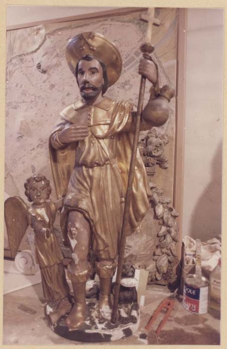 La statue comporte une terrasse semi-circulaire sur laquelle sont rapportée- s les figures de l'ange et du chien. Le bourdon est également rapporté, la gourde est fixée par une cordelette.