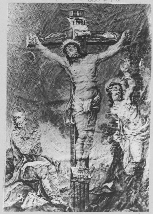 Christ en croix : saint Joseph (?), saint Sébastien, symbole christique (I.N.R.I.) ; Vierge à l'Enfant (assis, sceptre, Enfant Jésus : globe, bénédiction)