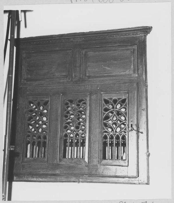 Le chambranle est particulièrement développé dans sa partie supérieure où il comporte deux panneaux rectangulaires moulurés et une corniche à denticules. En partie basse le vantail, monté sur deux petits gonds, est orné de trois panneaux rectangulaires verticaux ajourés juxtaposés et présente une entrée de serrure à droite.