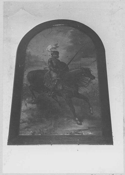 Le saint est représenté en armure et casqué, chevauchant un cheval richement harnaché. Il tient une lance dans la main droite et un bouclier au bras gauche. Le sol est couvert d'herbages.