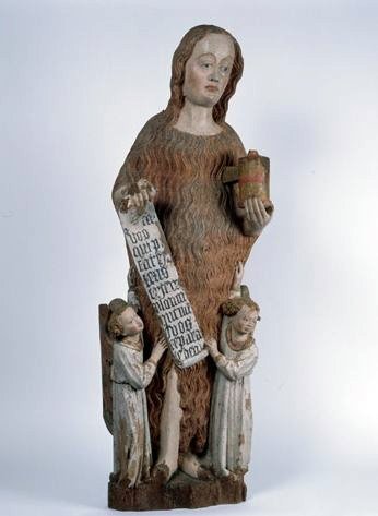 Cette statue de sainte Madeleine pénitente enlevée par deux anges pourrait dater du 15e ou du 16e siècle.