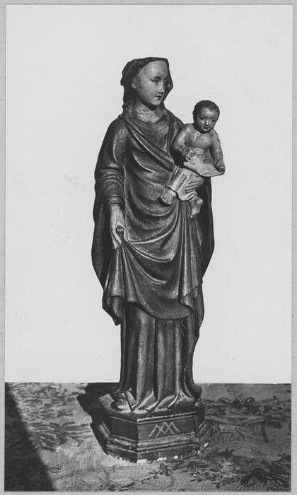 Polychromie ancienne restaurée (?) Sommet du crâne de la Vierge et pied gauche de l'Enfant mutilés.