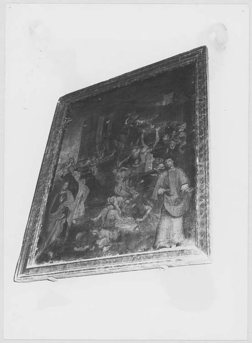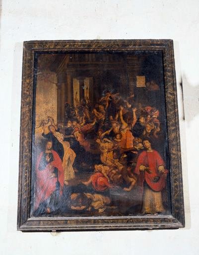 Le tableau, représentant le Massacre des Innocents avec saint Jean et saint Etienne, d'après Rubens, est pratiquement illisible et difficilement datable étant donné son très mauvais état de conservation : 17e siècle ? Le cadre pourrait être plus récent.
