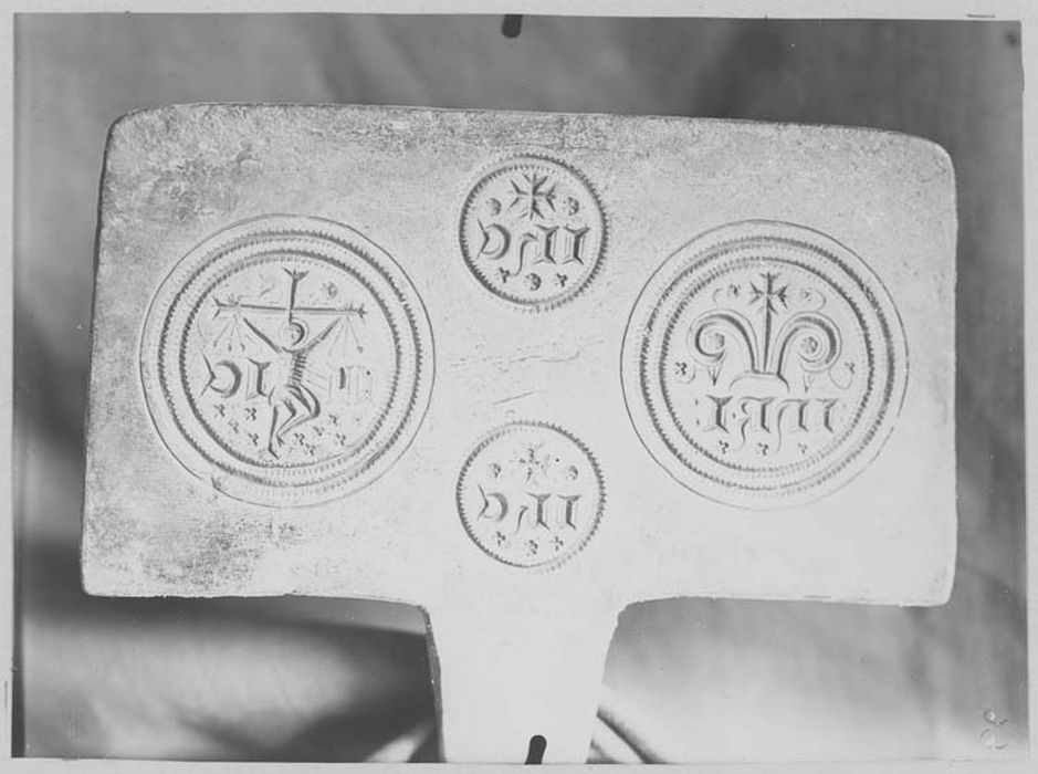 La grande hostie droite présente le symbole christique I.N.R.I., au-dessous trois fleurettes à quatre pétales, et au-dessus une large fleur de lys dont les volutes sont fleuronnées et la tige amortie en croix tréflée. La grande hostie gauche présente le Christ en croix : les extrémités de la croix sont découpées en trèfle à lobes pointus, soleil et lune surmontent la traverse ; la tête du Christ est droite et nimbée, son corps s'affaisse, des mains coulent trois jets de sang ; dans le champ, le symbole christique I.H.C. et un semis de fleurettes cruciformes à la partie inférieure. Les petites hosties comportent un décor identique : symbole christique I.H.C. avec semis de cinq fleurettes à six lobes et, au-dessus, une croix tréflée.