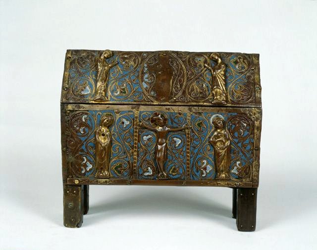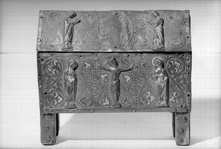 Les plaques de l'avers sont décorées de rinceaux en cuivre réservé sur fond d'émail bleu. A la caisse les trois figures du Calvaire sont rapportées. Au rampant, seuls subsistent les deux personnages d'applique qui encadraient un Christ bénissant d'applique, disparu, mais dont on distingue bien la silhouette en réserve. Les pignons présentent les figures de saint Pierre et de saint Paul sur fond émaillé semé de losanges. La plaque de la caisse au revers présente dans un lacis de rinceaux deux médaillons circulaires ornés d'anges à mi-corps. Les bandeaux latéraux sont décorés de rinceaux.