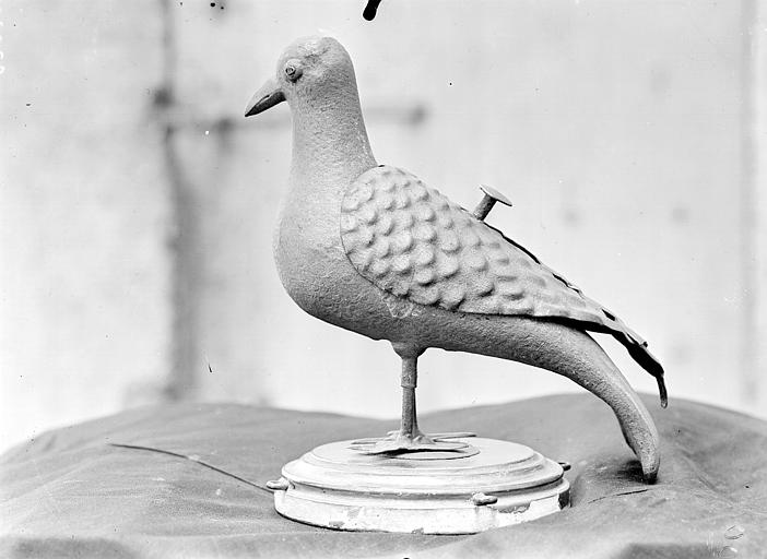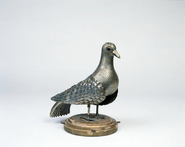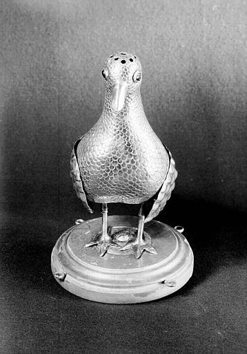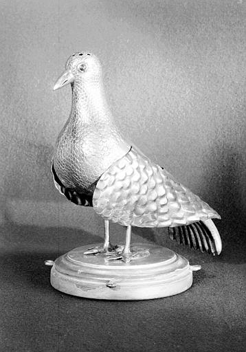 L'oiseau est constitué de trois plaques de cuivre assemblées par soudure : une pour la tête, une pour le ventre et, venant en recouvrement, une plaque pour le dos (où a été découpé l'orifice qui permet d'accéder à l'intérieur creux) ainsi que de deux plaques articulées formant les ailes. Les yeux sont constitués de petits verres rouges cerclés d'argent (?) Le bec est doré à la bronzine. Les pattes sont fixées sur un socle en bois doré mouluré de section circulaire, dont la tranche comporte des anneaux auxquels on attachait des chaînes de suspension en cuivre doré. Le dessus de la tête comporte neuf petits trous dont un au centre.