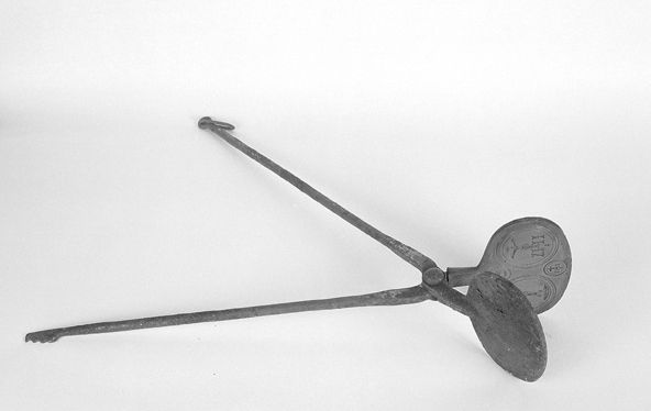 Les plaques de ce fer à hosties sont ovales. Les tiges sont maintenues fermées par un anneau ovale. L'une des plaques est gravée de quatre matrices circulaires, deux grandes sur les côtés et deux plus petites au milieu.