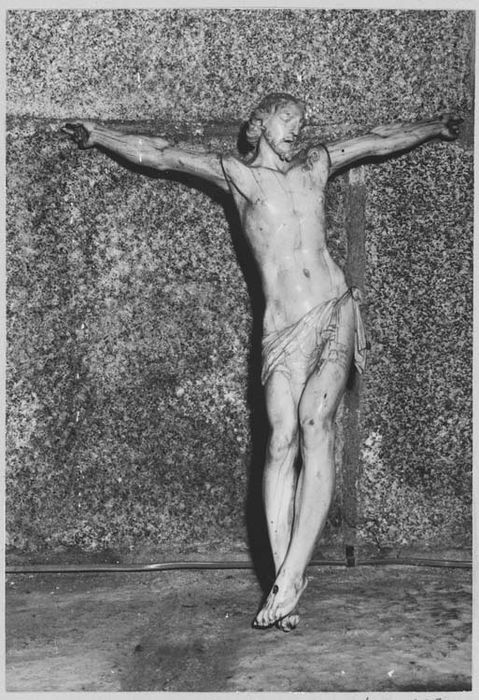 Christ très finement traité (rendu anatomique), il incline très légèrement la tête vers la gauche, son perizonium noué à gauche dévoile largement sa cuisse droite. Il ne porte pas de couronne d'épines.