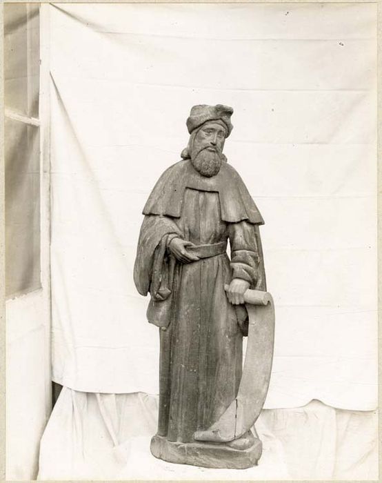 Statue remise en état par Marcel Maimponte en 1956, pour figurer à une exposition : phylactère partiellement refait, polychromie enlevée (?) Bois vermoulu.