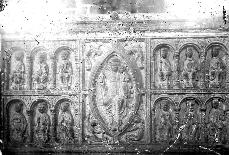 ornementation (à palmette, à perle, à pomme de pin, à rinceau, à médaillon, à arcature, à colonnette, chapiteau) ; acrotère ; Christ glorieux (le Tétramorphe, mandorle) ; ange ; Agneau de Dieu (croix grecque) ; Vieillards de l'Apocalypse ; Vierge à l'Enfant (assis, auréole, lys, Enfant Jésus : sceptre : ?, mandorle : ange)