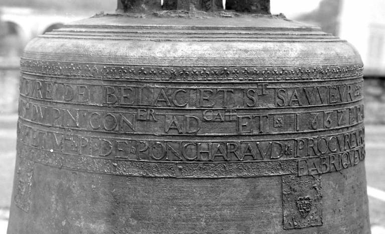 Inscription, marque de fondeur et date d'après Lecler : + SIEUR DE MOULINIER, DOCTEUR EN THEOLOGIE, CURE DE BELLAC ET SAINT-SAUVEUR. 1637. PARRAIN GUILLAUME, FILS DE NOBLE J. DE PONTCHARAUD, SIEUR DU PIN, CONSEILLER, ADVOCAT ET PROCUREUR DU ROI. MARRAINE DAMOSELLE MARGUERITE FAYDAU. Me BADOU. J. BADOU, PRETRE ET Me P. DE PONTCHARAUD, PROCUREUR DU ROI, FABRIQUEURS. + TOBIE DE LA PAIX. A. BEZOT, M'A FAICTE.