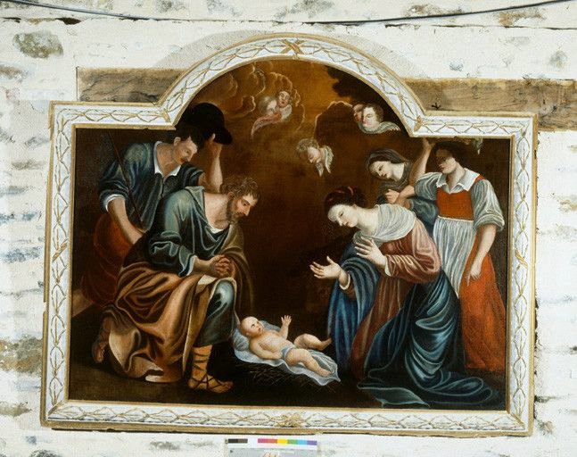 Au centre de la toile figure l'Enfant Jésus nu, sa tête est posée sur un coussin. La Vierge et saint Joseph sont agenouillés respectivement à droite et à gauche. Derrière saint Joseph, un berger s'incline, soulevant son chapeau de la main gauche et tenant un bâton de l'autre. Derrière la Vierge se tiennent deux bergères, l'une porte une corbeille sur la tête, l'autre croise les mains sur sa poitrine. Au niveau du cintre de la toile cinq angelots émergent d'une nuée.