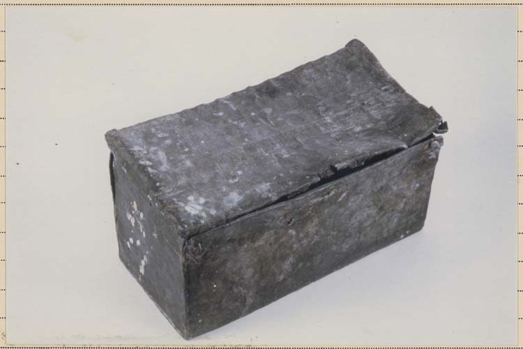 Châsse de forme parallélépipédique constituée par 6 plaques de plomb assemblées par soudure. Elle ne possède aucune ouverture.