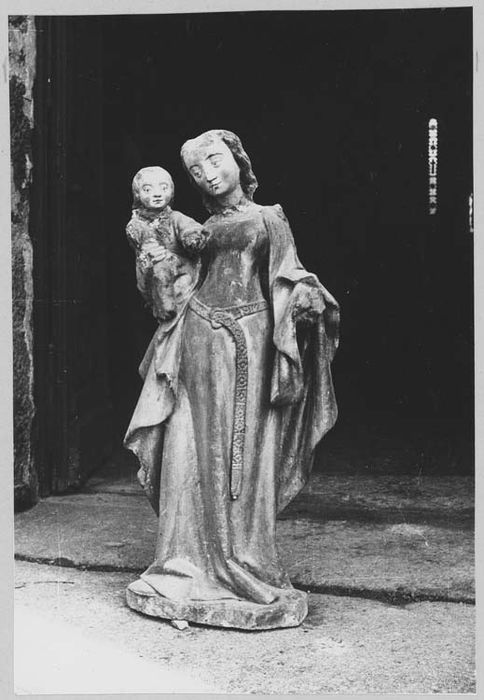 Oeuvre en très mauvais état : mains et tête du Christ mutilées, tête de la Vierge cassée au niveau du cou et décalottée, main gauche et grappe cassées, nombreux éclats le long du manteau. Un morceau de la grappe est déposé et conservé dans une vitrine. Le badigeon de peinture dorée est moderne.
