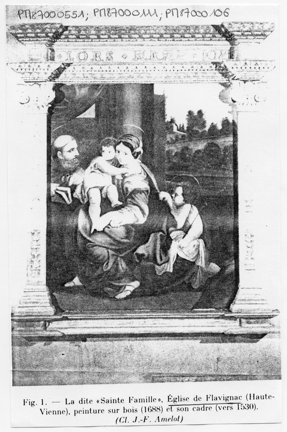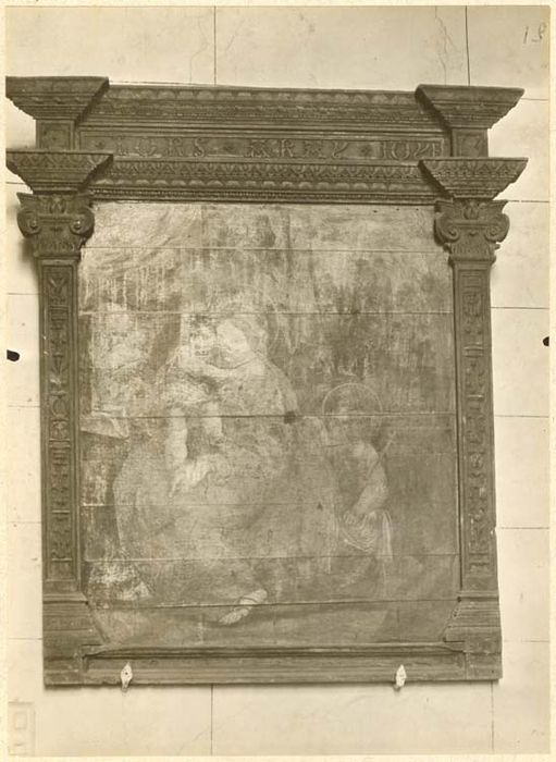Oeuvre surdécorée (?) : il semble que la peinture ait été réalisée sur les planches déjà assemblées dans le cadre, peut-être sur une oeuvre plus ancienne. Le tableau a été restauré par Pierre Laure, le cadre par l'entreprise Marcel Maimponte, tous deux en 1984.