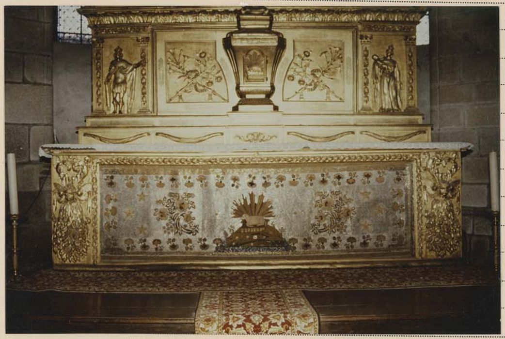 Ce retable en bois doré du 18e siècle est plaqué devant le retable en granite et le coffre à reliquaires de la 1ère moitié du 15e siècle (cf. notice PM87000477).