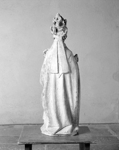 La polychromie de la statue n'est plus visible qu'à l'état de traces, notamment dans les deux tiers inférieurs. La main gauche manque, les doigts bénissants de l'autre main sont cassés, quelques fleurons de la tiare sont brisés.