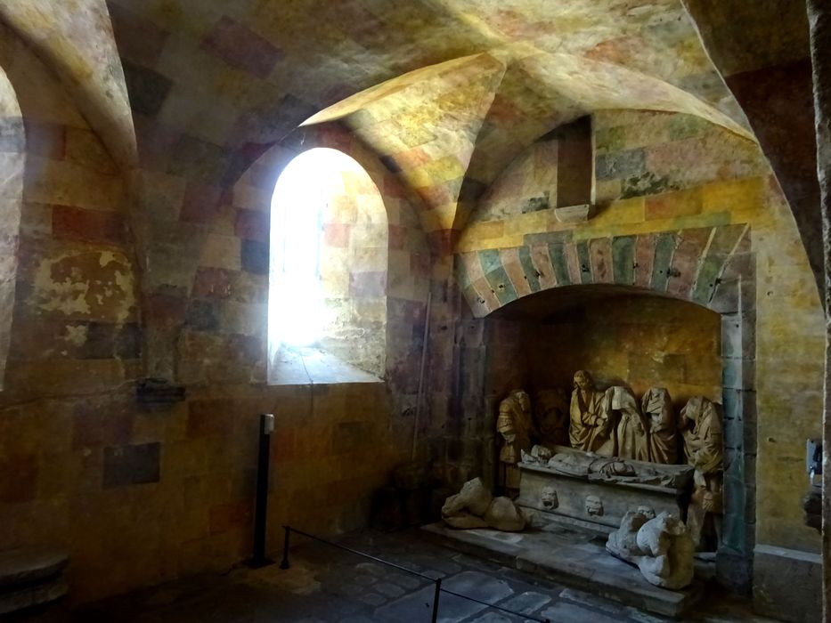 Devant le tombeau sont disposées les deux statues des soldats endormis (sur le ventre pour celui de gauche et sur le dos pour l'autre). La façade du tombeau présente trois têtes de lion qui tiennent dans leur gueule de gros anneaux. Sur le dessus, le corps du Christ est sculpté en haut relief, il est traditionnellement placé sur le linceul que tiennent Nicodème, à gauche, et Joseph d'Arimathie, à droite. Tous deux sont richement vêtus et portent des sacoches en bandoulière. A l'arrière, saint Jean soutient la Vierge avec Marie-Madeleine et deux saintes femmes.