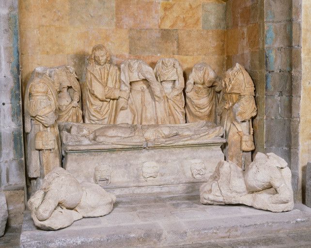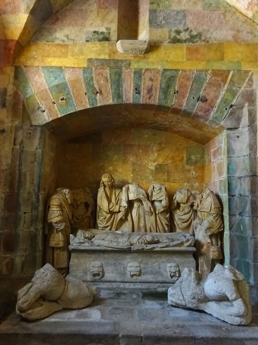 Ce groupe sculpté non relié est composé de huit éléments en calcaire sculpté et polychromé dont les revers sont plats : les statues de Nicodème et de Joseph d'Arimathie placées de part et d'autre du tombeau surmonté du gisant ; derrière celui-ci un groupe relié de trois personnages est encadré par deux statues ; deux autres statues sont disposées à l'avant du tombeau. Les éléments placés à l'arrière du tombeau sont d'origine tronqués dans leur partie inférieure, et sont posés sur un degré maçonné.