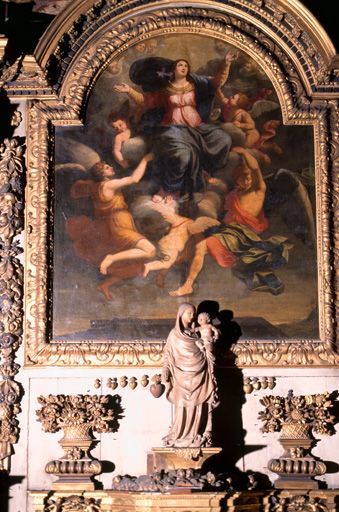 L'Assomption : la Vierge, vêtue d'une robe rose et d'un manteau bleu, est emportée au ciel par des anges : deux sont représentés sous les traits de jeunes hommes et trois autres comme des enfants joufflus ; le fond du fronton est occupé par une nuée peuplée d'angelots ; en bas, un linceul recouvre partiellement le tombeau vide. Saint Jean : le saint porte une tunique verte et un manteau rouge, il tient sous son bras gauche le livre de son évangile et lève la main droite ; son visage imberbe est traité en clair-obscur et se détache d'un fond relativement sombre habité par l'aigle sur la droite. Saint Joseph : vêtu d'une tunique échancrée bleue et d'un manteau moutarde passé sur l'épaule gauche, il tient une tige de lys dans la main droite et pose son autre main sur son coeur ; ses traits sont ceux d'un vieillard chauve à barbe blanche.