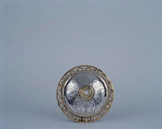 Au revers du pied sont insculpés deux poinçons partiellement illisibles ; on y reconnaît le poinçon d'un maître-orfèvre parisien : fleur de lys entre deux grains. A côté est insculpé le poinçon de la marque du fermier Jean-Baptiste I Lucot en usage du 1er octobre 1674 au 5 août 1677 : un A couronné entouré de trois fleurs de lys. La bordure supérieure de la coupe présente aussi des poinçons : l'un du 18e siècle (lettre-date ?) dont la lecture est impossible ; néanmoins on distingue un curieux poinçon circulaire (non identifié) représentant une tête de femme (genre Méduse) vue de face, sa graphie rappelle les poinçons français d'avant 1838. Poinçon moderne : 427 sur la bâte du pied.