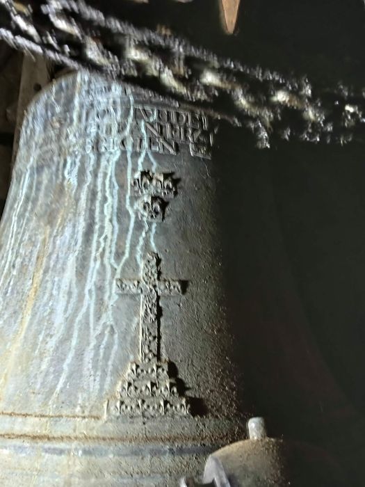 Cloche en bronze décorée d'un crucifix fleurdelisé. Sous la signature se trouve un décor représentant deux anges soutenant une cloche.