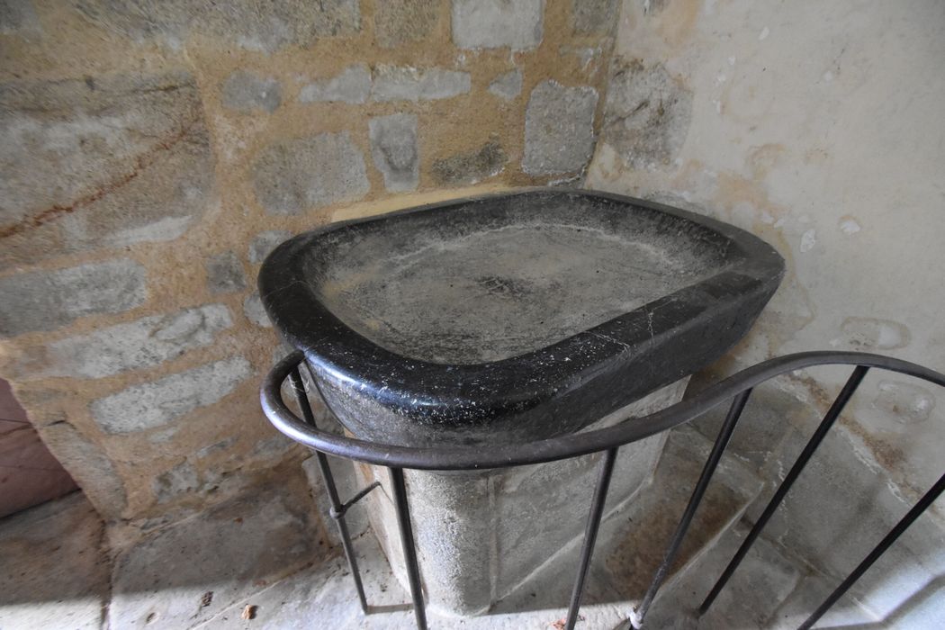 Bénitier en serpentine (dite localement marbre noir) sur un socle en granit. La cuve en serpentine est de forme rectangulaire à angles arrondis et de faible épaisseur, sans aucun décor.