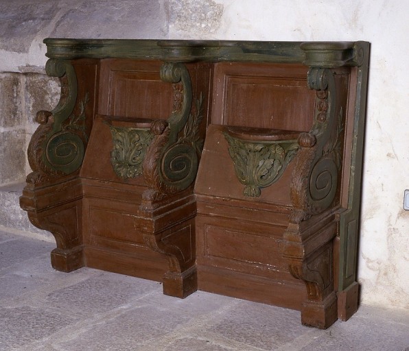 Miséricordes sculptées de feuilles grasses et feuilles d'acanthe. Parcloses et accotoirs en volutes feuillagées.