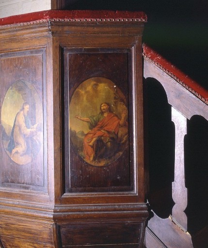 Sur le dorsal est peint un grand Christ de profil, sur fond de paysage, faisant un geste de prédication ou d'accueil. Sur les panneaux de la cuve sont peints, dans des médaillons ovales, de gauche à droite : saint Matthieu écrivant son évangile, avec l'ange, saint Marc tenant une tablette, assis dans un paysage avec le lion, saint Luc agenouillé de profil, tenant un livre ouvert, avec le boeuf, saint Jean l'évangéliste à Pathmos avec l'aigle. Sur le panneau rectangulaire du portillon est peint un saint en pied. Colombe du Saint-Esprit en relief sous l'abat-voix. Volutes découpées en couronnement de l'abat-voix.