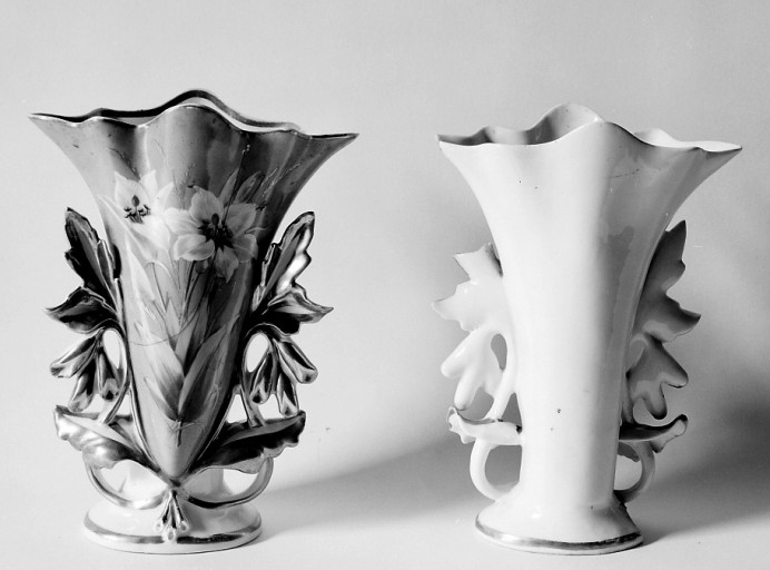 Objets de grande série en médiocre état de conservation. Des nombreux vases en porcelaine recensés et photographiés dans cette église par l'Inventaire en 1978, il ne reste plus que cette paire, un vase signé 'Achille Julien, 1874' (très endommagé), et deux ou trois vases dépareillés.