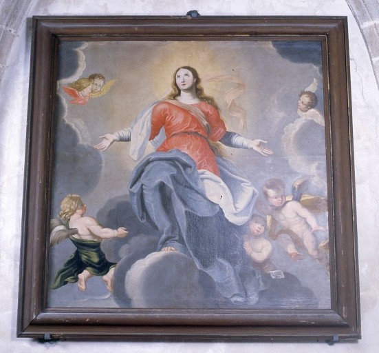 Tableau réalisé par Jean Laroche, peintre à Limoges, en 1676. Il s'agit d'une copie partielle de la partie haute du tableau d'autel de la chapelle du collège des jésuites de Limoges, attribué à Gérard Seghers (notice PM87000176) : la Vierge sur une nuée, les anges portant la nuée (à l'exception de celui du haut à gauche, omis), les nuées rayonnantes au-dessus de la Vierge (les trois angelots peuplant ces nuées ne sont pas conformes au modèle).