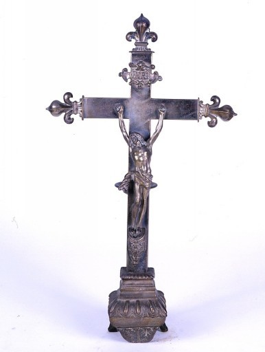 Croix fleurdelisée. Christ et titulus d'applique. Le pied de la croix est fixé dans une sorte de douille (?) d'un métal grossier.