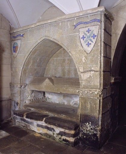 Enfeu maçonné voûté en arc brisé, abritant un monument funéraire en forme de sarcophage avec toit en bâtière en croix latine. Des écus, modernes, sont peints sur les écoinçons de l'enfeu,