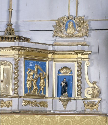 Statuette de saint Priest évêque, en bois peint (hauteur 32 cm), dans la niche de l'aile droite du tabernacle : disparue depuis la photo CAOA de 1983.
