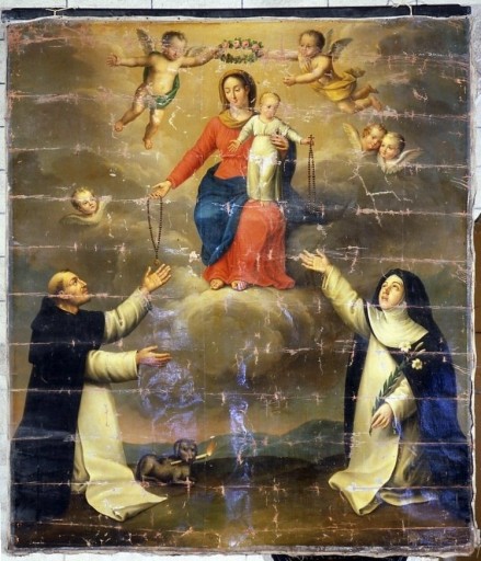 Arrêté : la remise du rosaire à saint Dominique et sainte Catherine de Sienne, huile sur toile, dernier quart du XVIIIe siècle.
