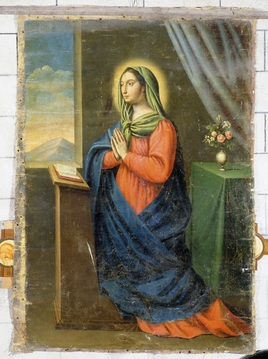 Paire de tableaux du 17e siècle, découverts avec 6 autres toiles au grenier du presbytère en 1994. Il s'agit d'une copie partielle et interprétée de l'Annonciation de Guido Reni (musée du Louvre, inv. 521). Ces deux toiles et les deux tableaux en pendant de saint Pierre et saint Paul (notice PM87001501), de dimensions et factures proches, formaient peut-être un ensemble et proviennent peut-être d'un même retable.