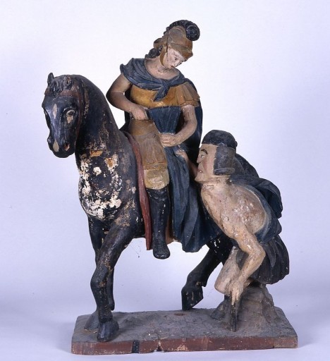 Ce groupe sculpté est clairement inspiré d'une gravure d'après Charles Le Brun. Une datation du 16e siècle est donc impossible, une datation du 17e siècle semble douteuse. Il date plus probablement des 18e et 19e siècles : importantes traces de réparations anciennes (cou et jambes du cheval), la tête du mendiant a très certainement été refaite par un sculpteur local.