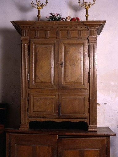 Corps haut de buffet, du 17e siècle. Il s'agit plus probablement d'un élément de meuble civil réemployé comme meuble de sacristie, que d'un rangement conçu à usage de meuble de sacristie dès l'origine.