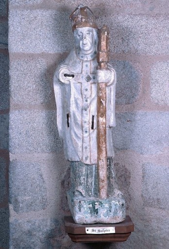 Statue de saint évêque, identifiée localement à saint Sulpice, patron de la paroisse. De facture locale, elle semble du 15e siècle, mais le badigeon blanc qui la recouvre en partie la défigure.