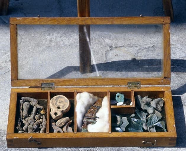 mobilier d'une tombe gallo-romaine : coffre et urne cinéraires, lacrymatoire, couteau, lampe