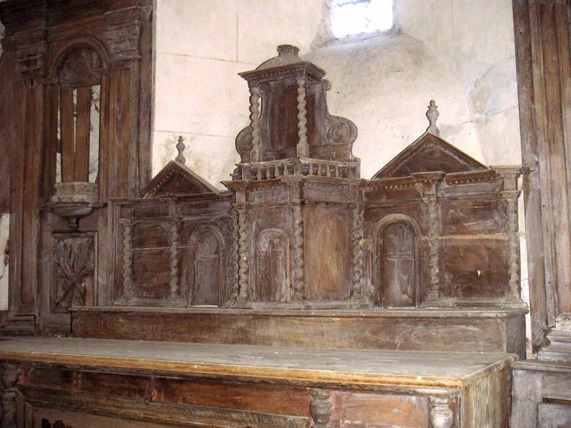 Autel tombeau droit au décor latéral de quatre colonnettes torses. Tabernacle à armoire eucharistique galbée, rythmée par une simple porte cintrée au motif de la Croix, puis par des colonnettes. L'étage de l'exposition est marqué d'une petite balustrade courant au-dessus de l'armoire, de colonnettes torses portant un dôme à lanternon (lacunaire ?) et de deux ailes latérales à volutes stylisées. Les ailes du tabernacle comprennent deux niches coquillées, associées à des panneaux pleins et en réserve, supports d'un entablement à fronton triangulaire et à larmier de denticules. Les deux frontons sont amortis d'un motif d'urne ou pot à feu. Les panneaux latéraux du retable sont faits - de bas en haut - de placards avec une porte à charnière présentant un motif central de médaillon ovale, d'une travée centrale à niche coquillée et à culot dont le soubassement figure un cartouche végétal (palmes, rubans). La niche est flanquée de pilastres à chapiteaux composites terminés d'un entablement architecturé fait d'une architrave, d'une frise et d'une corniche à denticules.