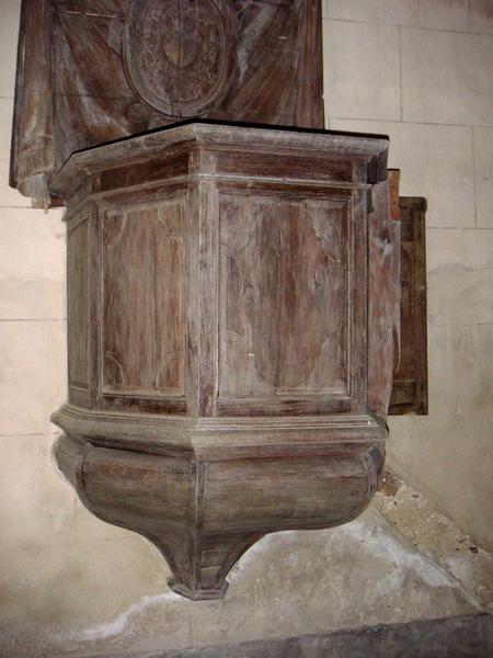 Chaire à prêcher adossée portant un escalier à rampe droite, aujourd'hui disparu. La cuve hexagonale suspendue a quatre panneaux moulurés à angles coupés, l'un d'eux forme le portillon à charnière. Le garde-corps est porté par un culot à arêtiers et le dorsal est orné d'un décor de fausse draperie liée à des rubans ouvrant sur un médaillon au coeur flammé. Seul, l'abat-voix, simple et polygonal, est à ce jour sans décor. Le décor théâtral du dorsal est fait d'une fausse draperie plissée prise dans un jeu de rubans : il est directement inspiré de l'esthétisme du 18e siècle. L'abat-voix porte des traces latérales et alignées de clous rouillés, il est probable qu'à l'origine un décor plus important s'y est développé : guirlandes végétales, toupies, etc.