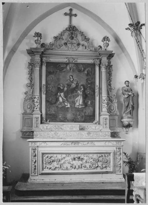 Le retable se compose de deux colonnes aux deux tiers supérieurs cannelés. Les colonnes sont sommées d'un vase de fleurs et le tout d'un fronton triangulaire.
