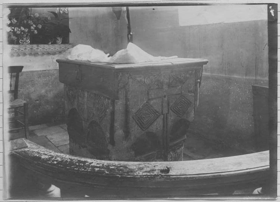 Cuve carrée avec deux faces sculptées et des traces de peinture ancienne.