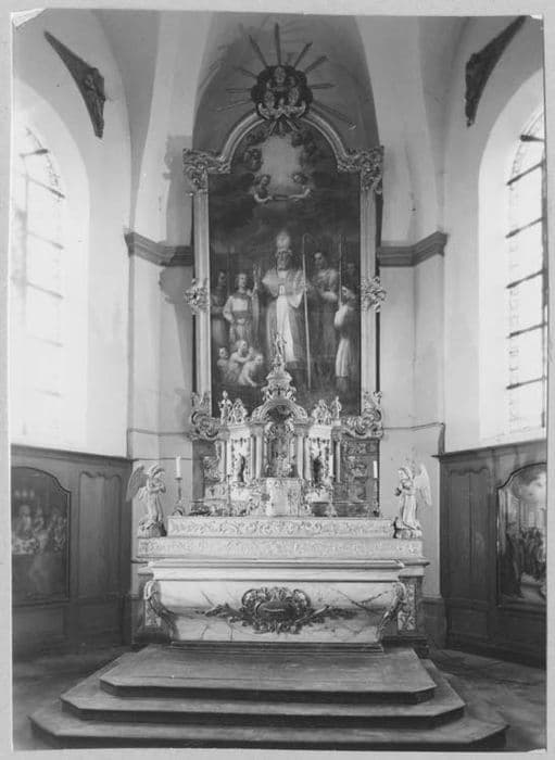 autel, retable, tabernacle, exposition, antependium, tableau et cadre : Saint Nicolas ressuscitant les trois jouvenceaux, 2 statues : Anges adorateurs (maître-autel)