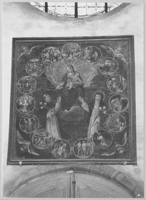 La scène est entourée de quinze médaillons sur les mystères du Rosaire.