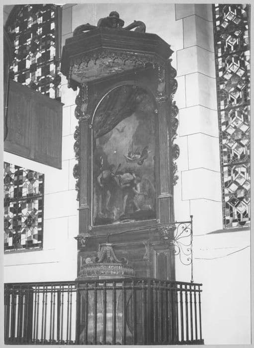 Fonds installés sur un petit podium de pierre accessible par quelques marches et entouré d'une grille. Les fonts se compose d'une cuve en grès recouverte d'un couvercle en bois, de forme octogonale. Contre le mur, un grand panneau de bois avec deux pilastres striés encadrant une toile représentant le Baptême du Christ, et un dais à cinq pans avec décoration à pendentifs.
