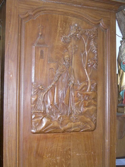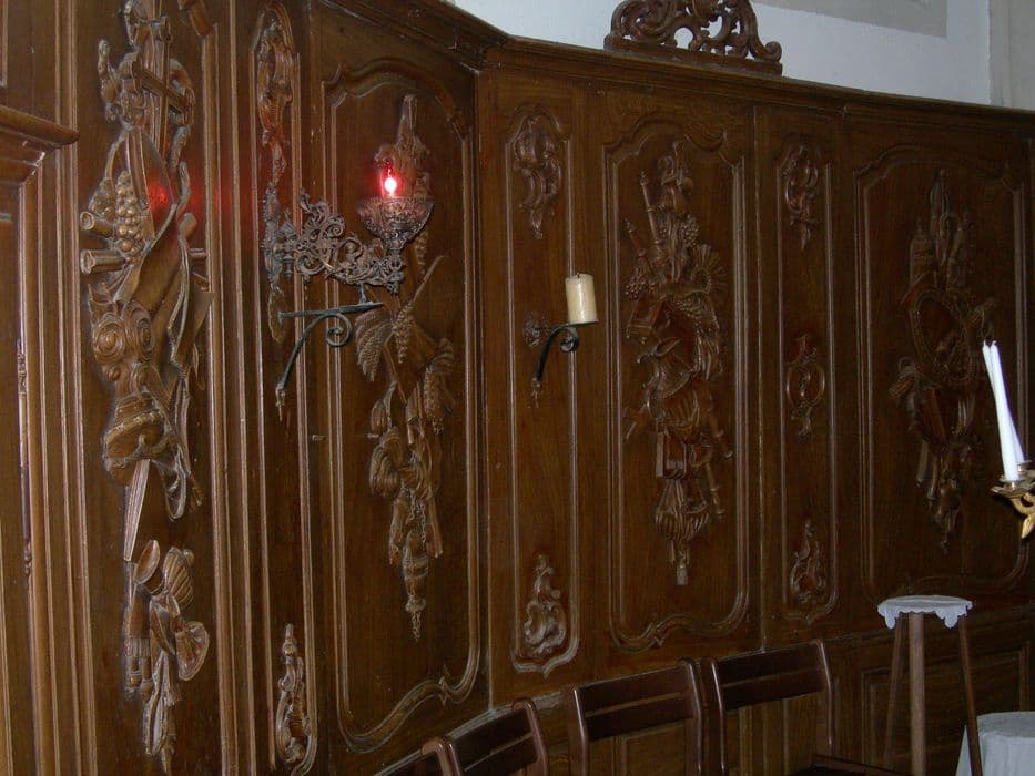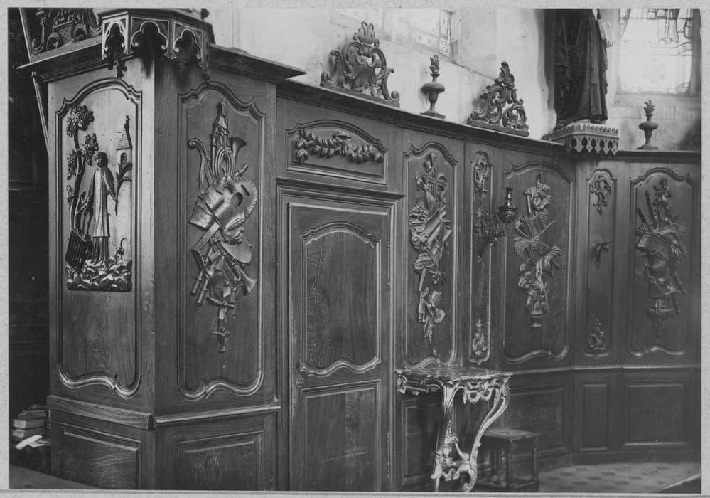 Larges panneaux à encadrement moulurés ornés des attributs liturgiques ou de musique et panneaux plus étroits ornés de relief en rocaille. Saint Laurent et saint Martin figurent sur les panneaux de retour de l'entrée.