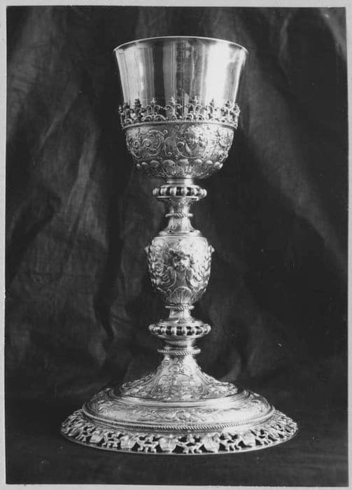 Coupe nue, légèrement évasée, insérée dans une autre faisant corps avec la tige, ornée de rinceaux et d'une couronne fleuronnée. Noeud ovale chargé de trois têtes d'anges ailées. Le pied se compose de couronnes concentriques soudées ensemble, la plus grande décorée d'une frise de fleurs ajourée.