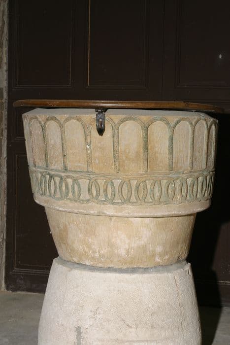 Cuve baptismale ronde, ornée d'arcades en plein cintre et de cercles de pénétrant.